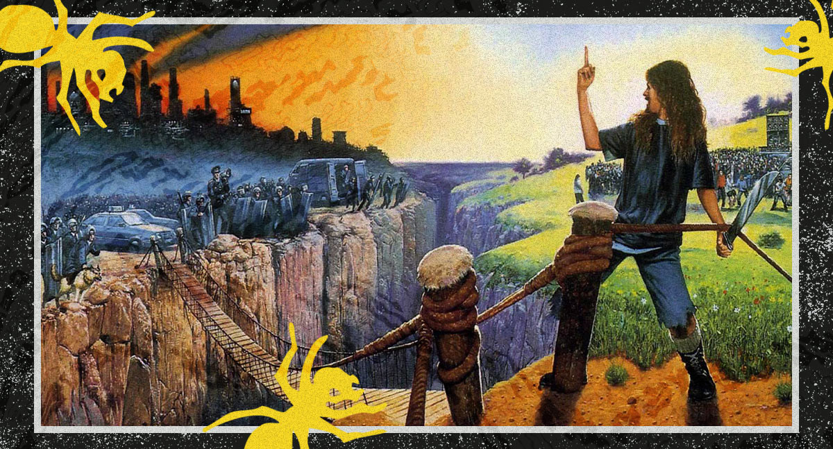 И вот вышли злополучные законы с запретами на массовые сборы (и даже на музыку, которую государство охарактеризовало как звуки, целиком или в значительной степени характеризующиеся последовательностью повторяющихся ритмических биений), и интересы Лиама Хоулетта вдруг совпали с интересами рейверов, и, конечно же, интересами тревелеров. Поэтому когда художник Лес Эдвардс получил творческое задание, он вполне хорошо понял, чего от него хотят. Он и сам когда-то был молодым бунтарем.