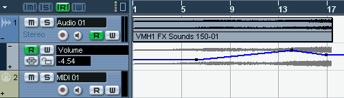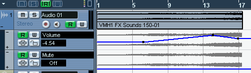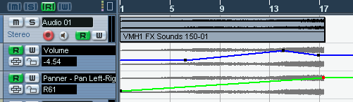 Все. Наша простейшая автоматизация готова. Самое главное, не путать ее с фейдами, описанными выше, потому как фейды действуют внутри конкретного аудио-фрагмента, а автоматизация уровня будет управлять громкостью всего канала.