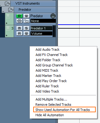 Для этого нажмем правой кнопкой на любом корешке дорожки или пустой области под корешками и выберем пункт «Show Used Automation for all Tracks»: