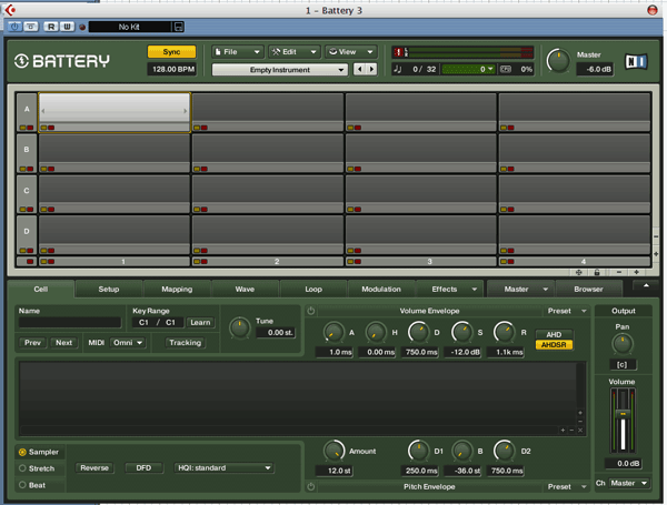 Верхняя половина окна Battery состоит из клеток, в которые мы будем добавлять семплы, а в нижней расположены вкладки со всеми настройками семпла и браузер для выбора семплов (вкладка Browser). Для добавления семпла в ячейку достаточно выбрать нужный файл в браузере и перетянуть его в ячейку.