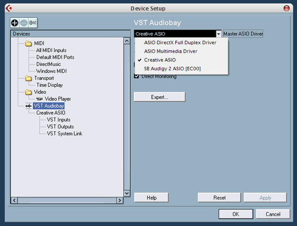 Но для начала следует проверить, не имеет ли Ваша карточка родной поддержки ASIO. Для этого запускаем Cubase и переходим в раздел меню Device -> Device Setup.