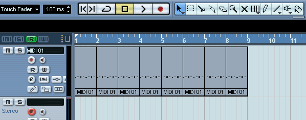 Выбираем квантайз 1/1, карандаш на панели инструментов и жмем карандашом по дорожке, назначенной на Battery. Появится фрагмент размером в 1 такт. Далее выбираем инструмент «Курсор» (клавиша «1») и двойной клик по фрагменту.