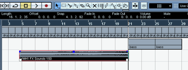 Следующее, что нам может понадобиться, так это разрезание аудио-фрагмента и кросс-фейд. Например, в том случае, если FX, который мы добавили, очень длинный в середине, и мы хотим его слегка сократить, оставив при этом его начало и концовку.