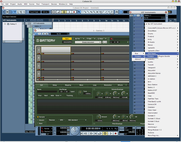 Далее нам необходимо добавить VST-инструменты и MIDI-дорожки для них. Начнем с инструментов. Они добавляются в соответствующем окошке VST Instruments, которое вызывается нажатием клавиши F11 или из меню (Devices -> VST Instruments). Здесь нажимаем в любой понравившийся слот (всего можно добавить до 64 инструментов) и выбираем нужные нам инструменты, например Battery 3 и Predator: