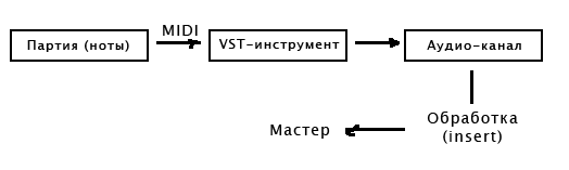 Итак, подведем итог всему выше сказанному и еще раз пройдемся по внутренней коммутации от нашей MIDI-дорожки до конечного мастера: