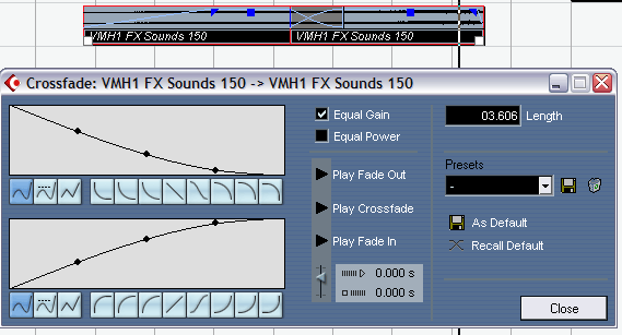Иногда, для дальнейшей работы с фрагментом, бывает нужно сделать из склеенного кросс-фейдом фрагмента один монолитный. Для этого мы можем воспользоваться функцией Bounce (Audio->Bounce Selection), предварительно выделив весь фрагмент. Однако, учитывайте, что при этом фрагмент сбросится в отдельный файл пула и вся история его обработки (Offline Process History) будет очищена. То есть, «баунсить» следует уже окончательный вариант фрагмента, изменять навешенную обработку которого вы уже не будете.