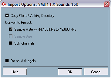 Галочка Copy File to Working Directory скопирует добавляемый файл в папку нашего проекта. Без этого конвертирование файла под формат проекта будет невозможно. Следующие галочки отвечают непосредственно за конвертирование. Галочки Sample Rate и Sample Size нужны в том случае, если частота дискретизации и битность добавляемого файла отличаются от настроек проекта. Галочка Split channels разобьет стерео-файл на две моно-дорожки. Нажимаем OK.
