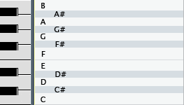 Полутона (черные клавиши) в Cubase обозначаются диезами (справка для людей без музыкального образования: белые клавиши – основные тона, черные – полутона, обозначаются они «диез» или «бемоль» в зависимости от расположения относительно основного тона). Диез (значок #) – выше, бемоль – ниже. Например, полутон лежащий между до и ре называется до-диез или ре-бемоль, и в Cubase обозначается как C#: