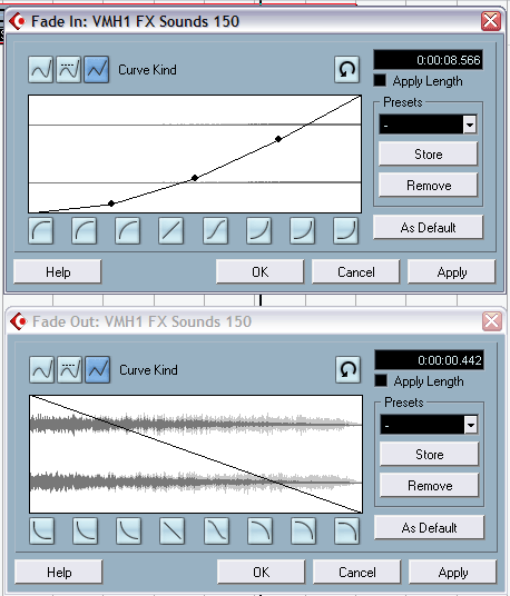 По-умолчанию Cubase создает прямые фейды которые ровно поднимут или опустят громкость до нужного уровня. Однако в некоторых случаях необходимо сделать фейд более плавным и обтекаемым. Для этого в Cubase существует очень мощный и гибкий инструмент – Fade Editor, вызываемый все из того же контекстного меню путем выбора пунтка Audio -> Open Fade Editor(s):