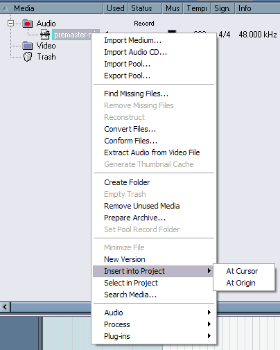 Правый клик по фрагменту откроет контекстное меню, из которого мы можем вставить фрагмент в проект: либо туда где он был первоначально, либо на позицию где сейчас стоит курсор; а также производить обычные действия обработки, уже нам знакомые (из меню Audio, Process, Plug-Ins):