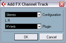 Для того чтобы организовать посыл, в Cubase для начала нужно создать специальный эффект-канал. Создается он там же, где и все остальные дорожки (правый клик по области с корешками дорожек или Project -> Add Track) пунктом Add FX Channel Track. Cubase сразу же спросит нас, какой эффект мы хотим использовать: