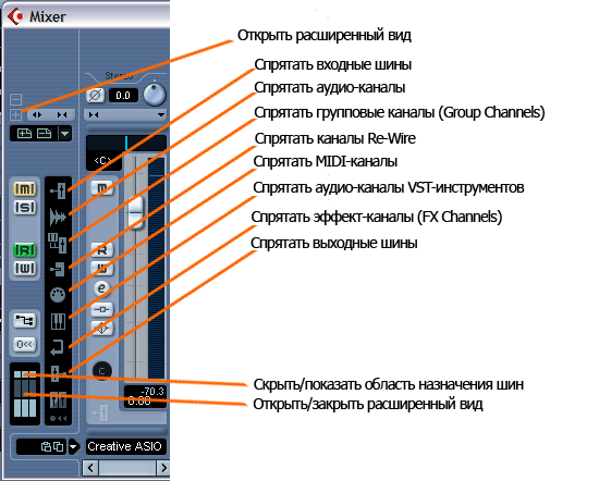 Для начала следует разобраться с опциями отображения и сразу отключить из микшера всё ненужное, например MIDI-каналы. Основные опции отображения регулируются в левой части микшера: