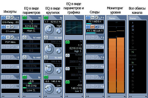 Теперь развернем микшер по вертикали кнопочкой с плюсиком в левой верхней части микшера (как показано на рисунке выше). Теперь мы можем выбрать один из режимов расширенного представления. Режимы представления также как и в базовом виде выбираются в левой части микшера. В расширенной части микшера мы можем управлять встроенным эквалайзером канала (такой вид выбран по-умолчанию), мониторить уровень звука каналов, управлять инсертами и посылами, и просматривать общий вид канала (будет показана вся обработка, которая висит на канале во всех ее вариациях):