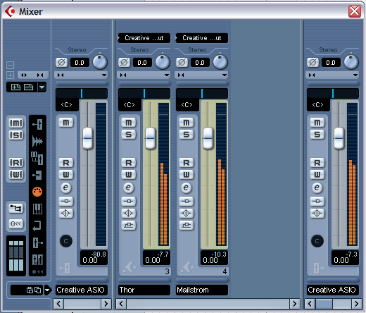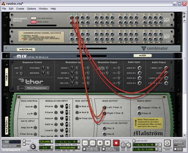 Это был простейший вариант с одним инструментом в Reason и одноканальным выходом из него. Добавим в Reason еще один инструмент, например Mailstrom, и подключим его по отдельному каналу. Для этого надо будет подключить выход инструмента непосредственно на выходные каналы 3-4 мастер-блока Reason, минуя микшер: