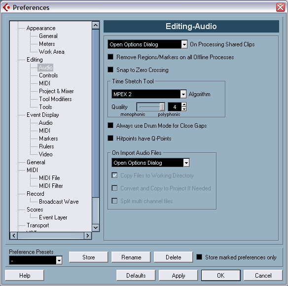 Для начала зайдем в настройки Cubase (File->Preferences) на вкладку Editing -> Audio:
