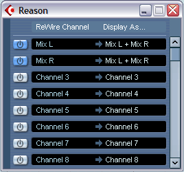Включим первую пару каналов, обозначенную как Mix R и Mix L. Эта стереопара представляет собой ничто иное, как мастер-выход с Reason'а, направленный в Cubase. В микшере и секвенсоре автоматически создастся канал ReWire, представляющий собой, по сути, обычный аудио-канал со всеми возможными с ним обычными действиями.