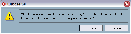 По аналогии попробуем назначить Alt+M для добавления MIDI-трека. Здесь Cubase скажет, что комбинация Alt+M уже была назначена на действие, и спросит, хотим ли мы отменить предыдущее действие комбинации: