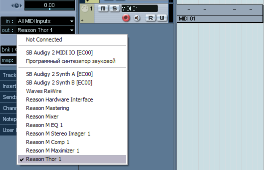 Выберем нужный нам инструмент, и, вуаля, связка готова! Партии с нашей MIDI-дорожки направятся по ReWire MIDI-каналу в Reason, откуда вернется на ReWire аудио-канал Cubase и будет воспроизведен в нашем проекте.