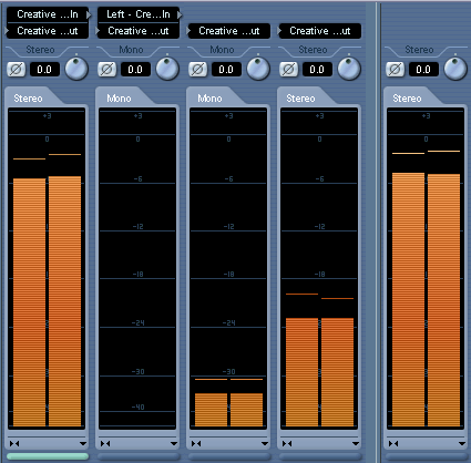 Наиболее важными и удобными режимами, на мой взгляд, являются режимы просмотра Insert-обработки, посылов, и, конечно же, мониторинг уровня. Первые два вида не нуждаются в каких бы то ни было особенных комментариях, их действие полностью прозрачно. С мониторингом уровня тоже все вроде бы прозрачно, однако есть одна удобная возможность, о которой следует знать. Если кликнуть один раз по полоске индикатора уровня, на шкале пропечатаются максимальные значения уровня (пики), которые были достигнуты во время воспроизведения. Выглядит это примерно следующим образом: