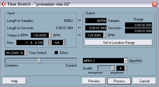 В секции Input в графе Tempo in BPM надо указать исходную скорость (128 BPM в моем случае), а в поле Output скорость нашего проекта соответственно. Также обратите внимание, что в правой нижней части окна присутствует выбор алгоритма. Выберем MPEX-2 максимального качества и нажимаем Process.