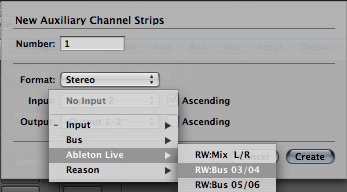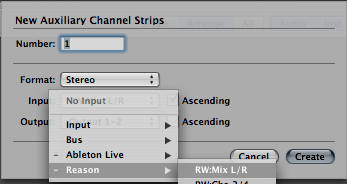 По аналогии добавляем AUX трек, на микшере Лоджика и на этот раз выбираем не Ableton Live, а Reason -> RW: Mix L/R