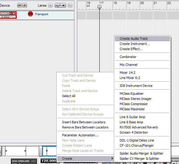 Первым делом необходимо переключиться в режим секвенсора (F7) и создать новую аудио-дорожку. Для этого необходимо кликнуть правой кнопкой по левой части области секвенсора и в контекстном меню выбрать Create -> Create Audio Track: