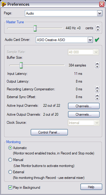 Здесь же включается метроном (кнопка Click) и «подхватка», так называемый преролл – воспроизведение нескольких тактов перед точкой входа в запись (кнопка PRE). Размер преролла задается в главном меню (Options -> Number of Precount Bars), и может составлять от одного до четырех тактов.