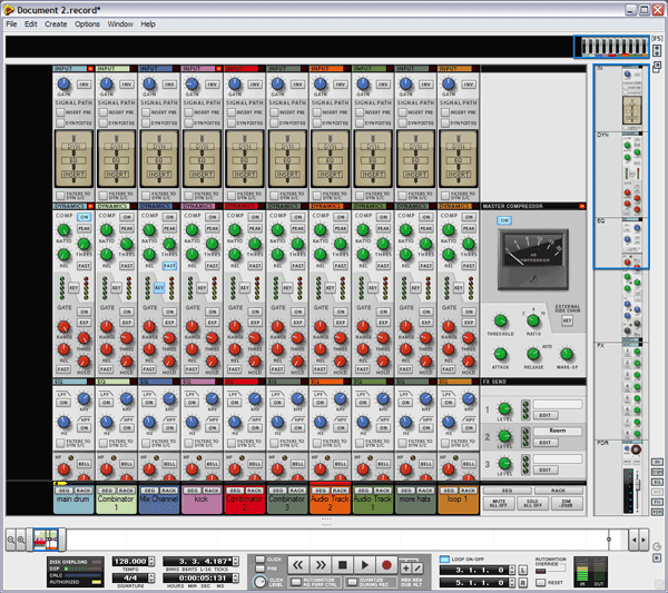 Микшер настолько высок, что даже при разрешении экрана 1280x1024 в развернутом на всю окне Record помещается только половина содержимого. Поэтому в самой правой части окна предусмотрена область Overview, где отображена линейка микшера в уменьшенном виде и можно перемещаться по микшеру в вертикальной плоскости. Там же имеется возможность скрыть (свернуть) ненужные нам блоки микшера, дабы несколько компактировать микшер: