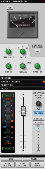 Если перейти в микшер, мы увидим, что для мастер-секции отведена дольно широкая линейка, в которой присутствует компрессор, Insert-настройки для уже добавленных в рэк мастер-секции трех приборов обработки, а также развитые возможности мониторинга конечного уровня и Control Room: