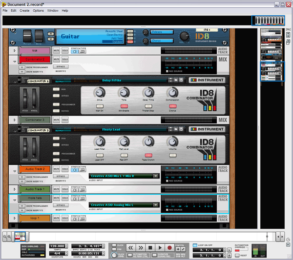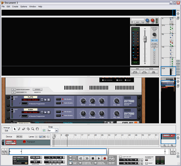 В уже знакомый по Reason'у интерфейс по сути дела добавили развитые возможности звукозаписи, ранее отсутствующие, функциональный микшер со встроенной динамической обработкой (достаточно неплохой) и специальные плагины, такие как, например, гитарный процессор POD с модулями для игры на элетро- и басгитаре, в разработке которого, как поведали нам Propellerhead, участвовали эксперты из лаборатории симуляции гитарных кабинетов и средств усиления Line 6.