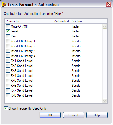 В поле Parameter мы выбираем непосредственно параметр автоматизации, в поле Section показано к какому блоку относится автоматизируемый параметр, а галочка «Show Frequently Used Only» отобразит только наиболее часто используемые, по мнению Record, параметры.