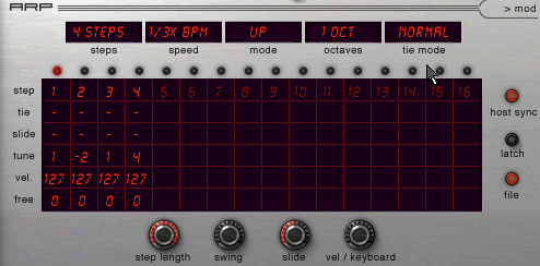 Арпеджиатор в Predator реализован в виде 16-шагового секвенсора, где мы можем определить параметры звучания для каждого из шагов. Шагов в принципе может быть и меньше, но не более 16-и. В настройках арпеджиатора мы можем определить такие основные и единые практически для всех арпеджиаторов параметры как: количество шагов (Steps), режим работы арпеджиатора (Mode) – будет он работать вверх, вниз, вниз-вверх или еще каким либо образом, диапазон в котором он будет действовать (Octaves) – от одной до четырех октав, и наконец, скорость относительно текущего BPM проекта – от 1/4 до 4 крат.