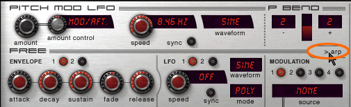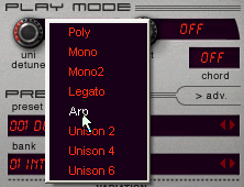 Давайте разберемся, как работают арпеджиаторы на практике. Для этого вернемся к нашему инструменту – Predator. Для начала нужно установить соответствующий режим воспроизведения. По умолчанию выбран полифонический режим - Poly. Нам надо заменить его на режим арпержиатора (Arp):