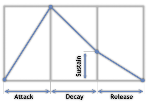 По первым буквам английских названий участков огибающей её для краткости обозначают как ADSR. Это обозначение можно встретить на многих инструментах.