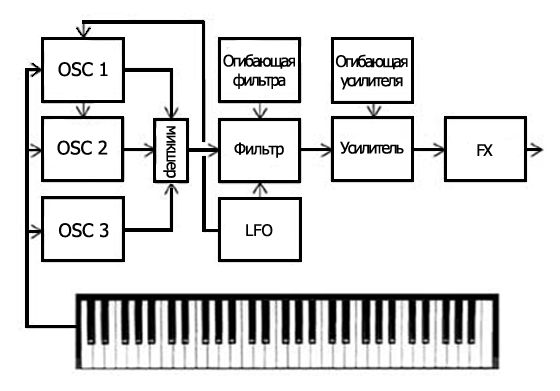 Перед тем как разбирать по отдельности модули синтезатора и предназначение каждого из них, давайте пройдемся по схеме синтезатора и посмотрим, из каких блоков он состоит, откуда берет начало сигнал и через что он проходит. Итак, взглянем на блок-схему синтезатора в типичном его виде: