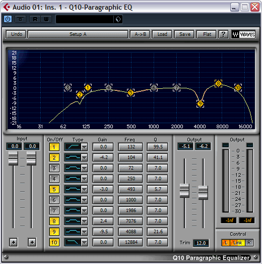 Если рассматривать пакет Waves, здесь у нас имеется довольно неплохой линейнофазовый компрессор в виде плагина LinEQ и фазосдвигающие эквалайзеры серии Q: Q1, Q2, Q4, Q6 и Q10. Отличаются они количеством полос от 1 до 10 соответственно.