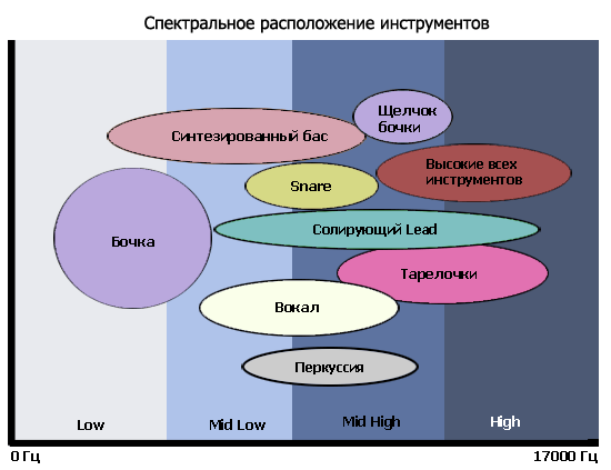 В любом случае, даже если спектральное расположение каких-либо инструментов вызывает у вас сомнение, вы точно сможете сказать, каких частот в ряде инструментов не будет. Например, хай-хеты совершенно точно лишены низа и нижней середины, солирующие инструменты и снейр лишены низа (максимум, могут присутствовать в нижней середине), и.т.д.