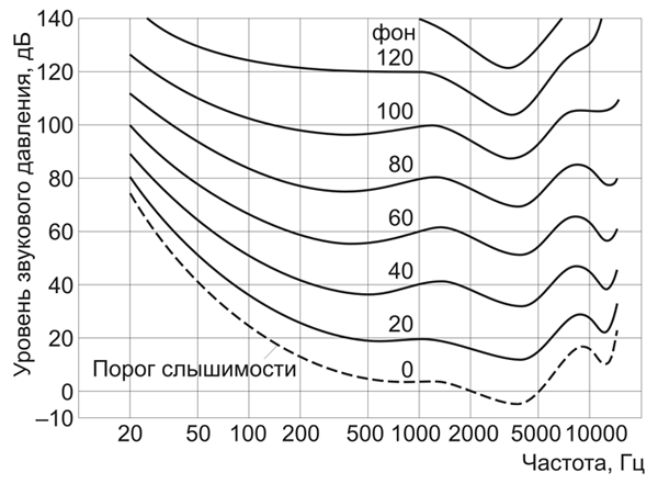 При этом наши ощущения изменения громкости звука неравномерны на разных частотных диапазонах. Говоря простым языком, некоторые частоты мы воспринимаем наиболее интенсивно, некоторые чуть менее. Это явление было описано при помощи так называемых кривых равной громкости: