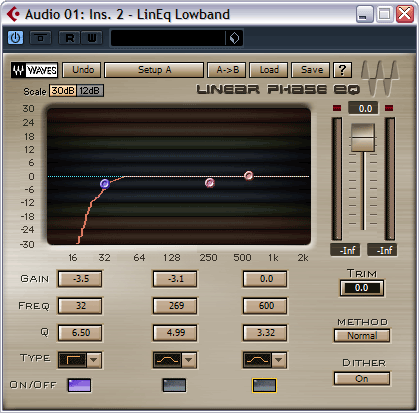 В таком случае следует обратиться к эквалайзеру LinEq Lowband. Это трехполосный линейнофазовый эквалайзер, предназначенный, как понятно из названия для работы с нижней и нижнесредней частотными полосами. Он позволяет работать с частотами от 11 до 600 Гц.