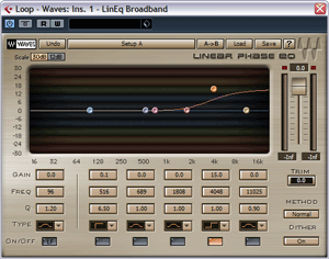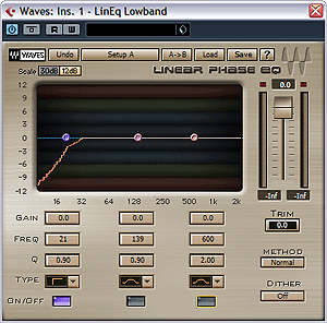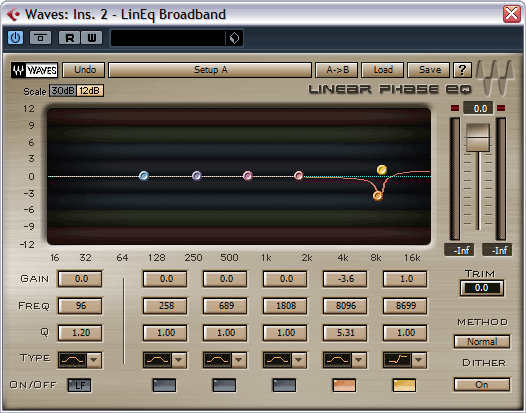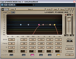При воссоздании мастер-канала с цепочкой плагинов UAD при помощи Waves я с досадой обнаружил, что эквалайзер Waves LinEq Broadband не обладает возможностью сверхрезкого среза нижних частот, поэтому мне пришлось использовать цепочку из двух эквалайзеров – LinEq Lowband для среза саббаса и LinEq Broadband для небольшого выреза свиста в районе 8 кГц.