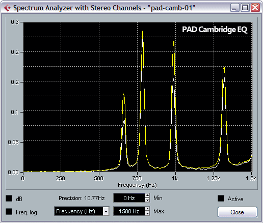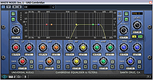 Для полной уверенности я решил провести также и синтетический тест. Суть теста заключалась в обработке эквалайзером предварительно подготовленного фрагмента белого шума уровнем -3 дБ. Для того чтобы добиться равной глубины среза на Waves LinEq и UAD Cambridge пришлось несколько повозиться, но в конечном итоге результат все-таки был получен.