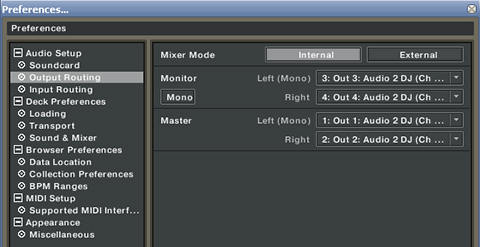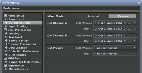 В диалоговом окне Preferences > Audio Setup > Output Routing выбираем Mixer Mode: Internal. В этом случае будет использоваться программный микшер, стерео сигнал с канала А будет подаваться на усилитель или активные акустические системы, а с канала В на наушники. Выходы 1: Out и 2: Out назначаются на Output Master. Выходы 3: Out и 4: Out назначаются на Output Monitor.