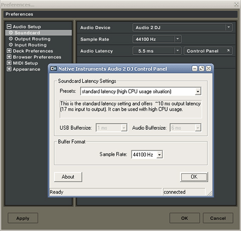 После установки драйверов производится настройка параметров Audio 2 DJ в программе Traktor. В меню и открывшемся диалоговом окне: Preferences > Audio Setup > Soundcard выбираем: