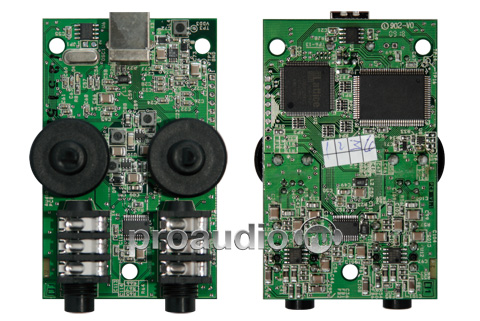 Электронная плата имеет качественный дизайн, двухсторонний монтаж и профессиональный набор компонентов. Среди них: программируемый DSP, стерео кодеки Cirrus Logic, операционные усилители JRC. Такие же стерео кодеки установлены на других продуктах NI: Audio Kontrol 1, Guitar Rig 3 Kontrol Edition, Audio 4 DJ, Audio 8 DJ. Таким образом, качество звука у Audio 2 DJ на уровне старших продуктов NI. Качественные потенциометры с контроллерами большого диаметра обеспечивают плавную регулировку уровня сигнала на стерео выходах. Они вращаются без люфтов, что предполагает длительный ресурс при частом использовании.