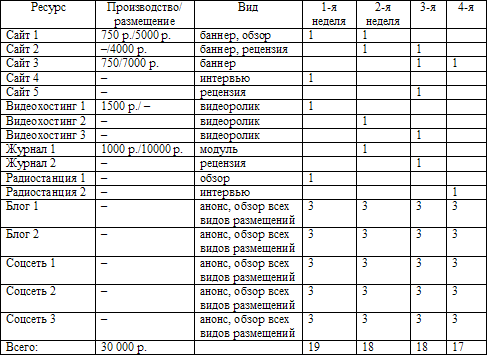 Преположим, диджей определился с количеством ресурсов, видами, стоимостью производства и размещения, сроками, и у него получился следующий медиа-план: