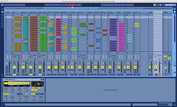 Назначение произведено, не забудьте все сохранить. Теперь ставим Beat Repeat на второй посыл, набираем выход с него на В-плечо Х-фейдера, а треки со 2 по 8 набираем в А-плечо. Теперь мы можем Х-фейдером заменять сигнал почти всех треков первой секции микшера, которые создают основной грув на результат обработки этих треков Beat-Repeater-ом. Сессия с изменениями выглядит, как на рисунке.