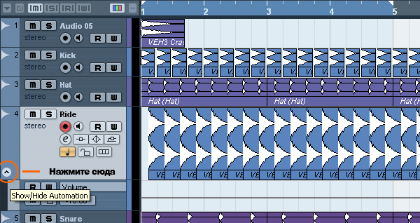 В Cubase любой автоматизированный параметр может быть представлен в виде отдельной саб-дорожки с кривой автоматизации. И самый простейший тому пример – громкость.