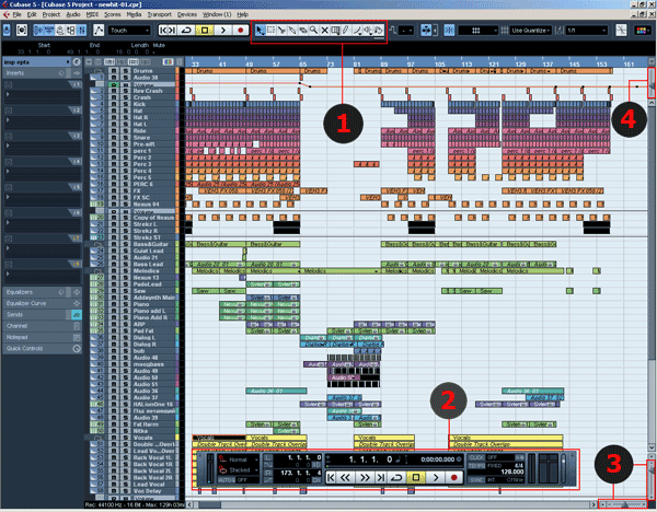 Как мы уже могли заметить, в верхней части рабочего окна Cubase присутствует панель инструментов курсора, при помощи которых можно выполнять различные манипуляции, как над аудио, так и над MIDI-клипами. На иллюстрации она отмечена под цифрой 1. Некоторые инструменты, такие как курсор, ножницы и карандаш мы уже использовали, вызывая их в нужном нам месте при помощи многофункциональной клавиши [Alt]. Теперь давайте рассмотрим всю панель:
