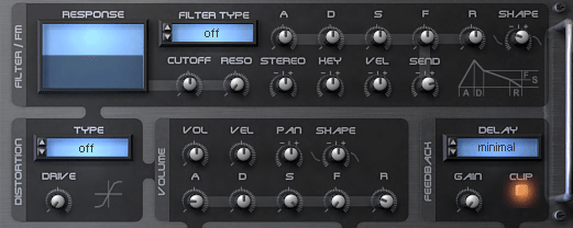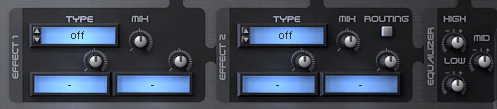 После того как мы получили нужный нам тембр при помощи выбора нужных волноформ осциллятора, настройки усилителя и фильтра, он попадает на блок эффектов, где мы можем назначить два регулируемых эффекта: