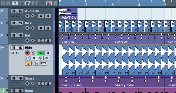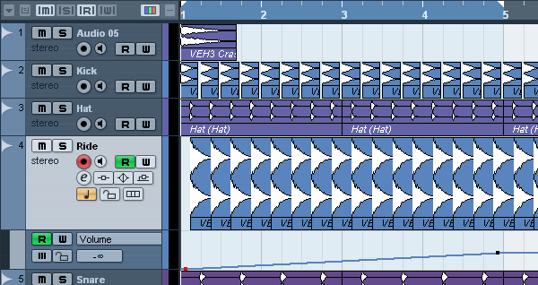 Начнем с самого простого вида автоматизации – регулировки громкости. Для начала добавим еще одну аудио-дорожку и загрузим туда семпл VES2 Ride 03 из библиотеки Vengeance Electroshock vol. 2. Райд является разновидностью хэта и мы его ставим на те же доли, где у нас стоит закрытый хэт: